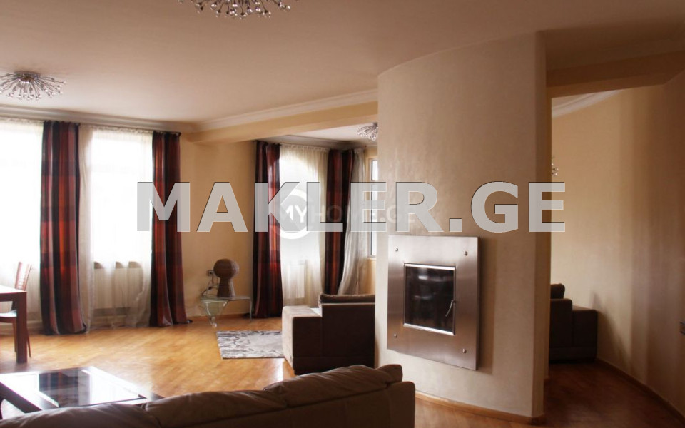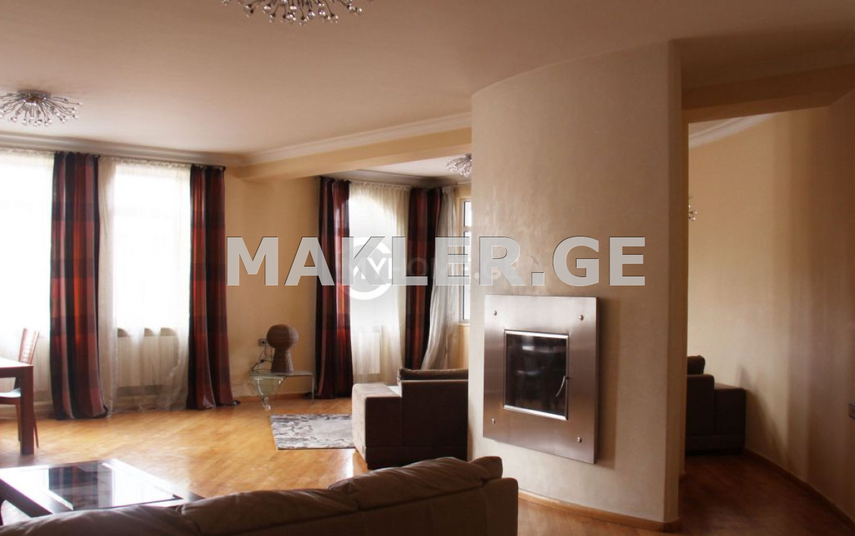 For rent in Mtatsminda, on Al. Chavchavadze Street, apartment 220 sq. m., 5th floor, newly renovated, 5 rooms, 2 bathrooms, 3 balconies, 2 car spaces in the garage, concierge in the entrance.