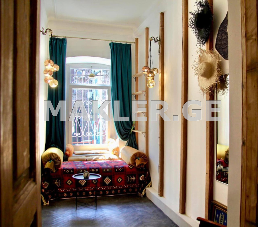 Located in a historic building, this 36.3 sq m apartment features high ceilings (3.7 m), a living room, a bedroom, a kitchen, a bathroom, a separate laundry room (1.7 m2) and a storage room (2.7 m2). This cozy apartment is thoughtfully designed and equipped with everything you need for a comfortable stay: a convenient kitchen with all the necessary appliances, a washing machine, air conditioning, heating and internet. A lot of interesting antique furniture and interior items create a unique atmosphere. This apartment has a dry basement (8.8 sq m), brick walls, electricity and quite high ceilings (2 m). You can arrange a workshop there... or just store wine.