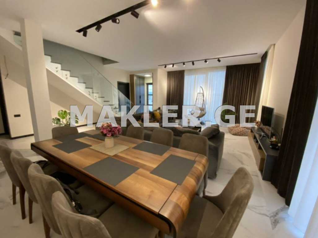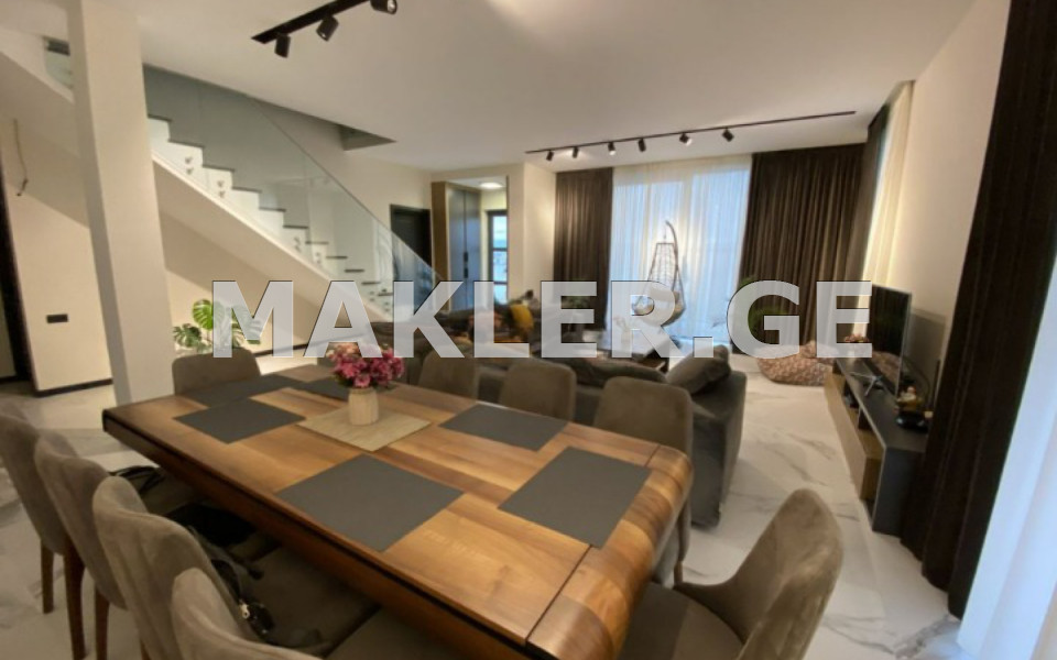 A modern private house is for sale in Didi Digomi. With panoramic views of the city, in a very quiet and cozy location. The house is built and renovated with premium quality materials. It is also equipped with the highest quality furniture and appliances (Belux, Comforter, Laboratory, Bosch, Samsung, etc.) The front facade of the house is covered with the highest quality ceramic granite, as well as the stairs with natural stone (traventine, Indian granite). The yard is covered with tiles from the company "Legi". The pool is equipped with filtration and a heating system.