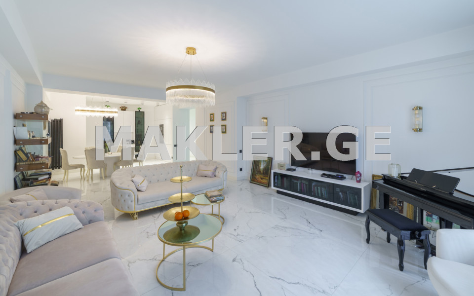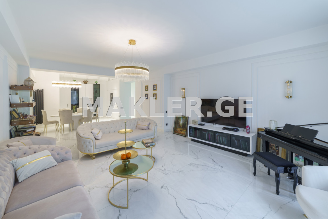 In Vake, at Tsereteli exit, next to the Wrestling Federation, in a building built with a high standards, we'd like to offer a very bright, newly renovated apartment. The apartment has a partially separate kitchen and consists of three bedrooms, one of which is provided with its own dressing room and bathroom. High-quality materials are used in the renovation and it isdecorated with tasteful furniture. The view from the bedrooms is towards the yard, therefore the apartment is cozy.