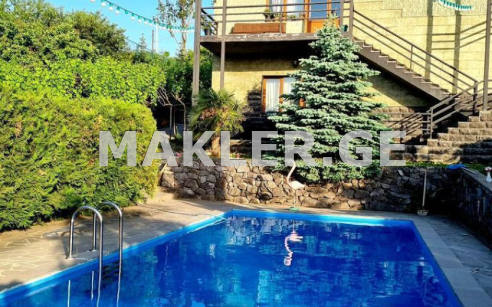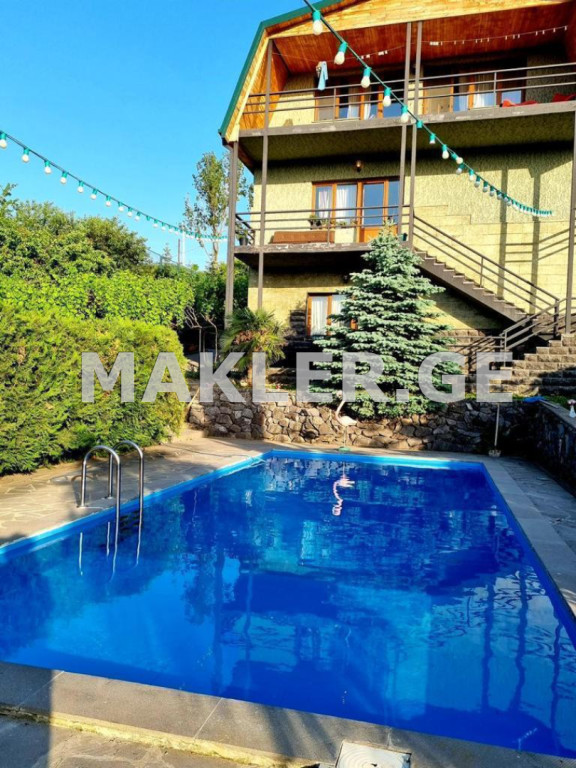 The house is located in Saguramo near the Ilia Museum, it is quiet and on a high ground and has wonderful views. The yard is paved, in the yard there is a swimming pool, a stadium, a children's pool, a gazebo, a veranda, a party room, outdoor showers and a toilet. The house is 3-storey with balconies on the front and back sides on all floors, the house has a fireplace and a cellar.