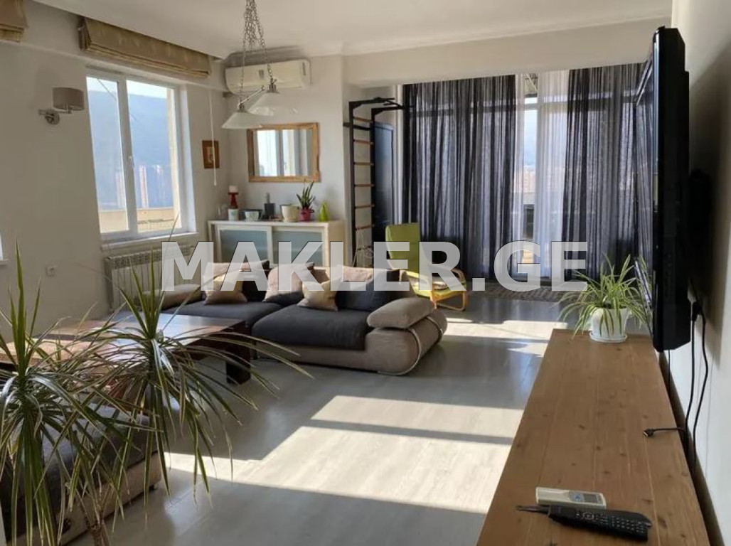 Very bright and sunny apartment for sale with beautiful, 360° views. The apartment has a large veranda around it, is completely isolated and cozy. Equipped with all necessary furniture and appliances. Living area 100 sq.m., isolated kitchen, storage room, large guest room and work space (office). Outdoor area 107 sq.m. Green, with wooden deck. Currently rented.