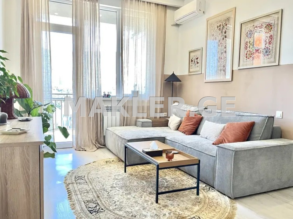 Naturally bright apartment with a large balcony and a great view. Fully furnished and equipped with all necessary appliances, electronics, central heating and air conditioning. An ideal choice for both living and renting.