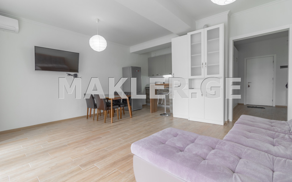Сдается 2-комнатная квартира с новым ремонтом в доме премиум-класса на улице Ир. Абашидзе, в одном из центральных и престижных районов города, Ваке. Здание построено строительной компанией GDG и отличается высоким качеством и стандартами. Холл оборудован камерами видеонаблюдения, консьерж, круглосуточная охрана и 2 лифта. Площадь 84 кв. м. представлена студийного типа, большой гостиной, изолированной спальней, гардеробной, 1 санузлом и балконом-верандой, на который есть выход как из гостиной, так и из спальни. Вид на улицу. Несмотря на центральное расположение, квартира довольно уютная. Интерьер, оформленный в светлых тонах, добавляет пространству света. Квартира полностью укомплектована бытовой техникой и мебелью, которая хорошо вписывается в интерьер.