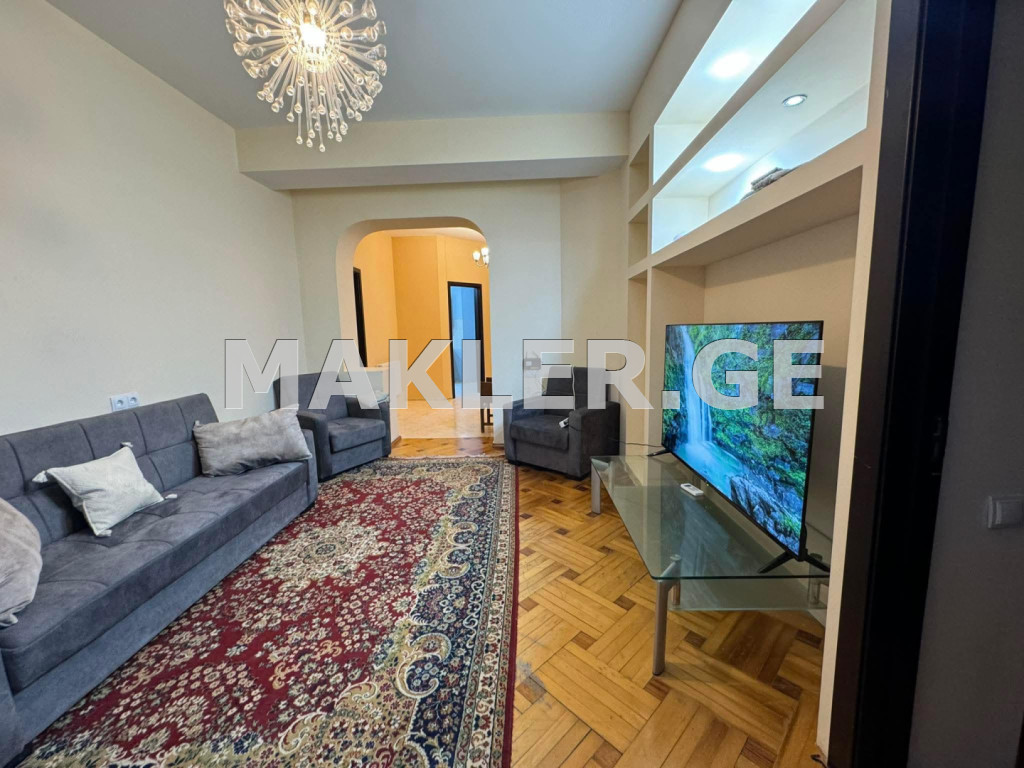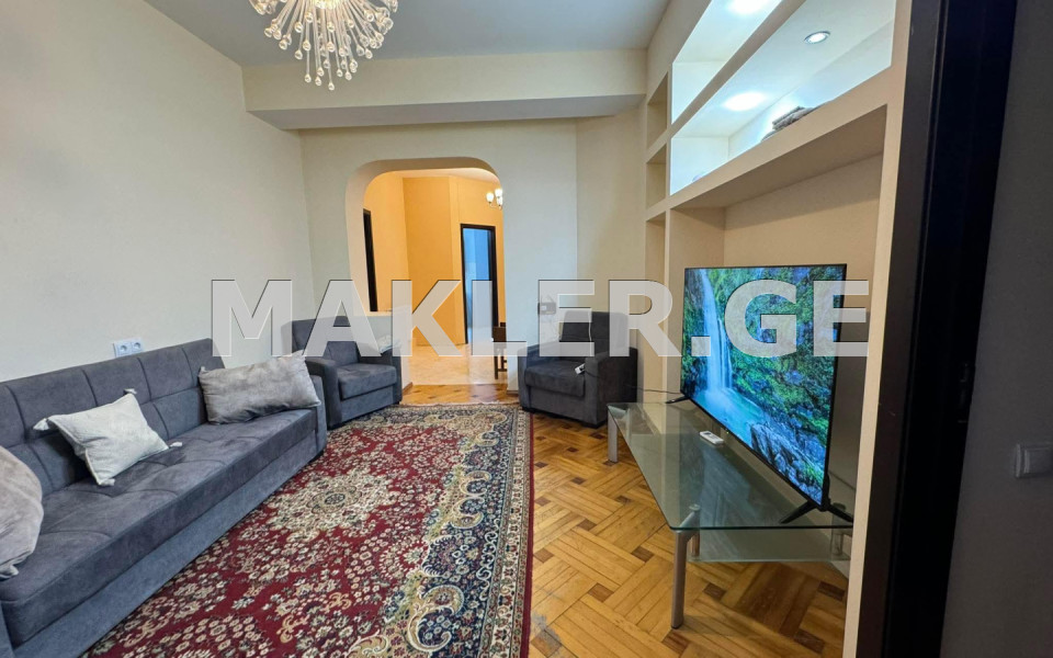 Квартира расположена на Мтацминде, в новом доме, недалеко от Вильнюсского парка. В квартире изолированная кухня.