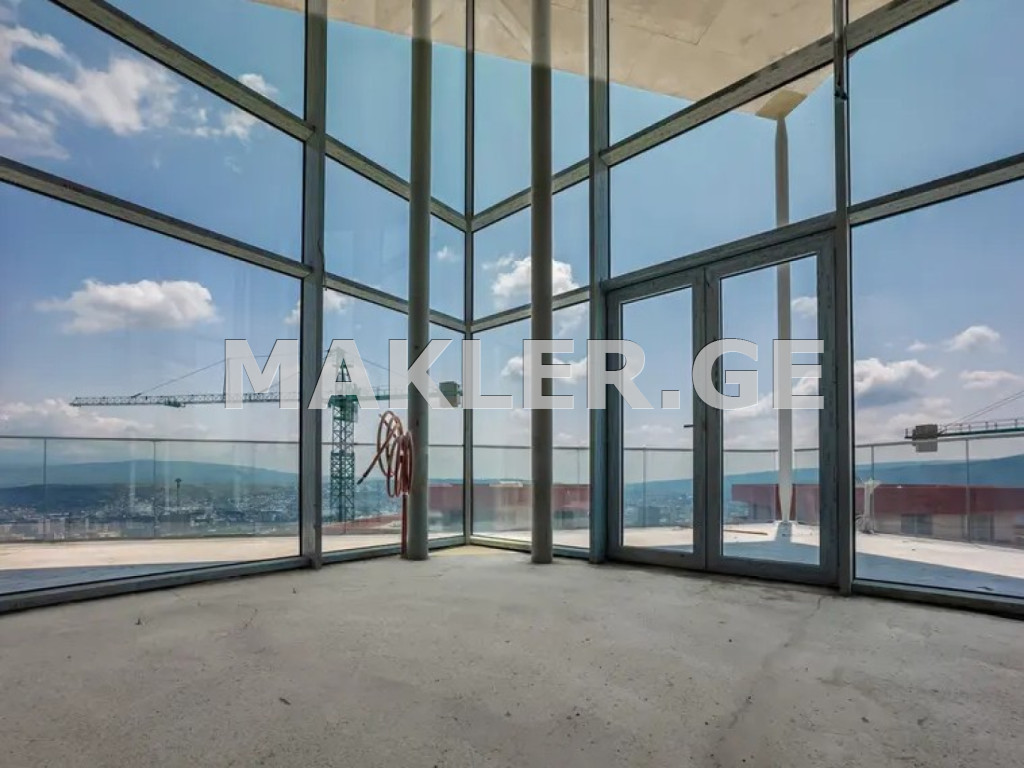 Квартира расположена в престижном здании недалеко от озера Лиси. В ней есть витражные окна, три ванные комнаты и панорамный вид на город.