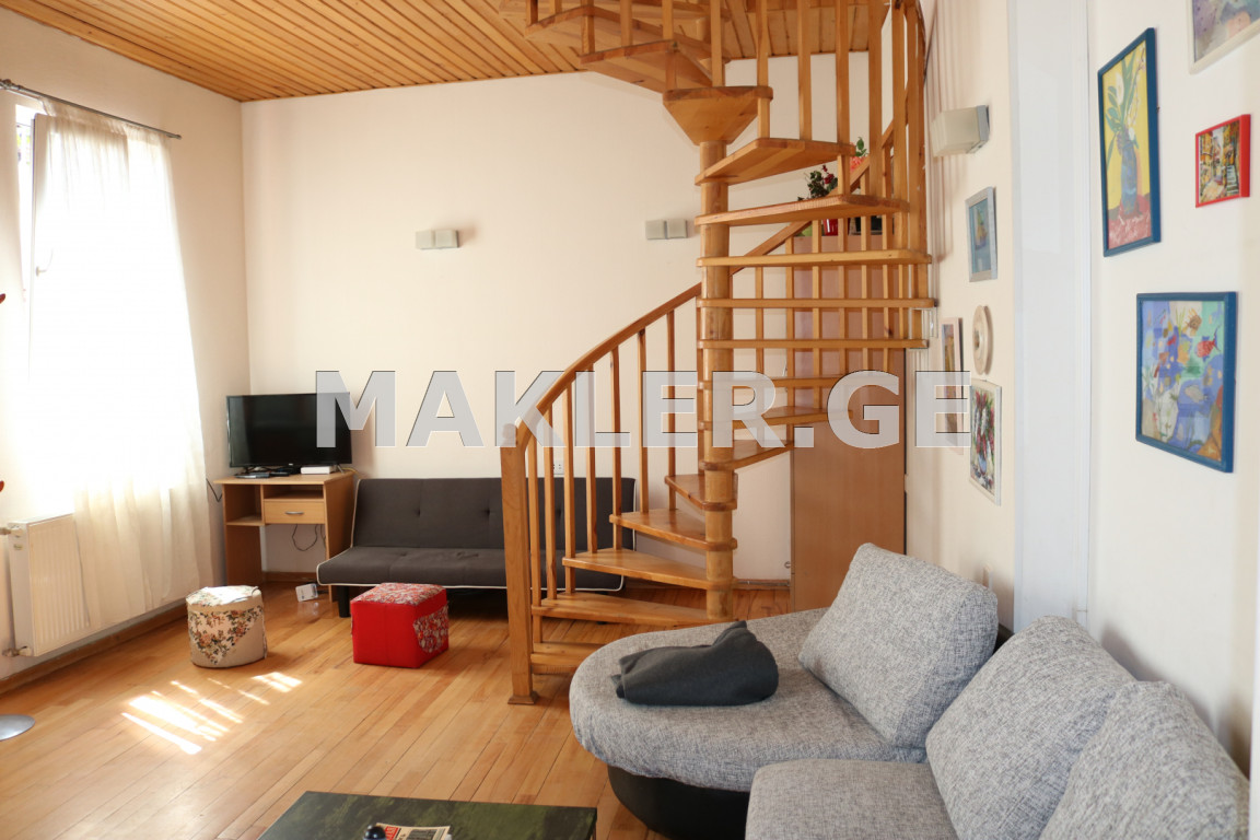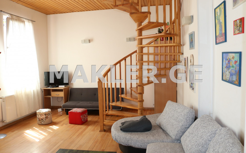 Сдается двухэтажный частный дом дуплексного типа. На первом этаже гостиная, кухня студийного типа, на втором этаже спальня с ванной комнатой. Дом уютный и светлый