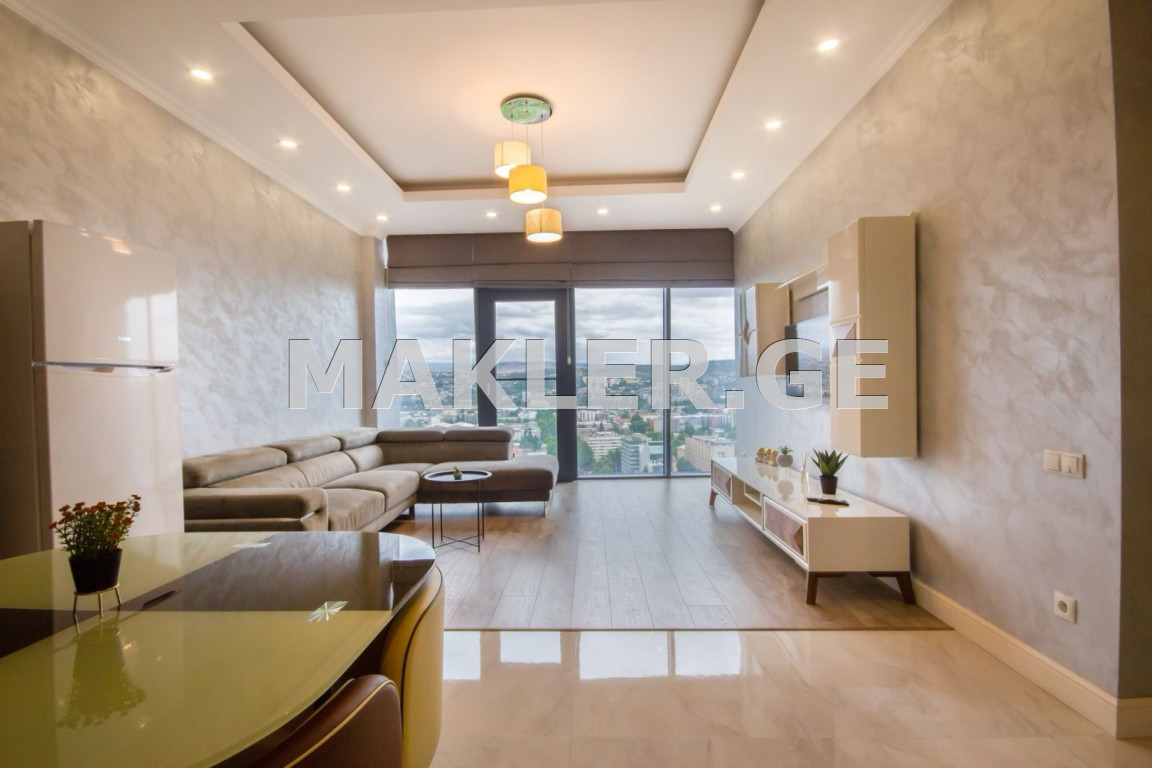 King David konut kompleksinde on beşinci katta kiralık daire, 3 oda, daire manzaranın keyfini çıkarabileceğiniz geniş pencerelere sahiptir, en yüksek kalitede mobilya ve aletlerle döşenmiştir.