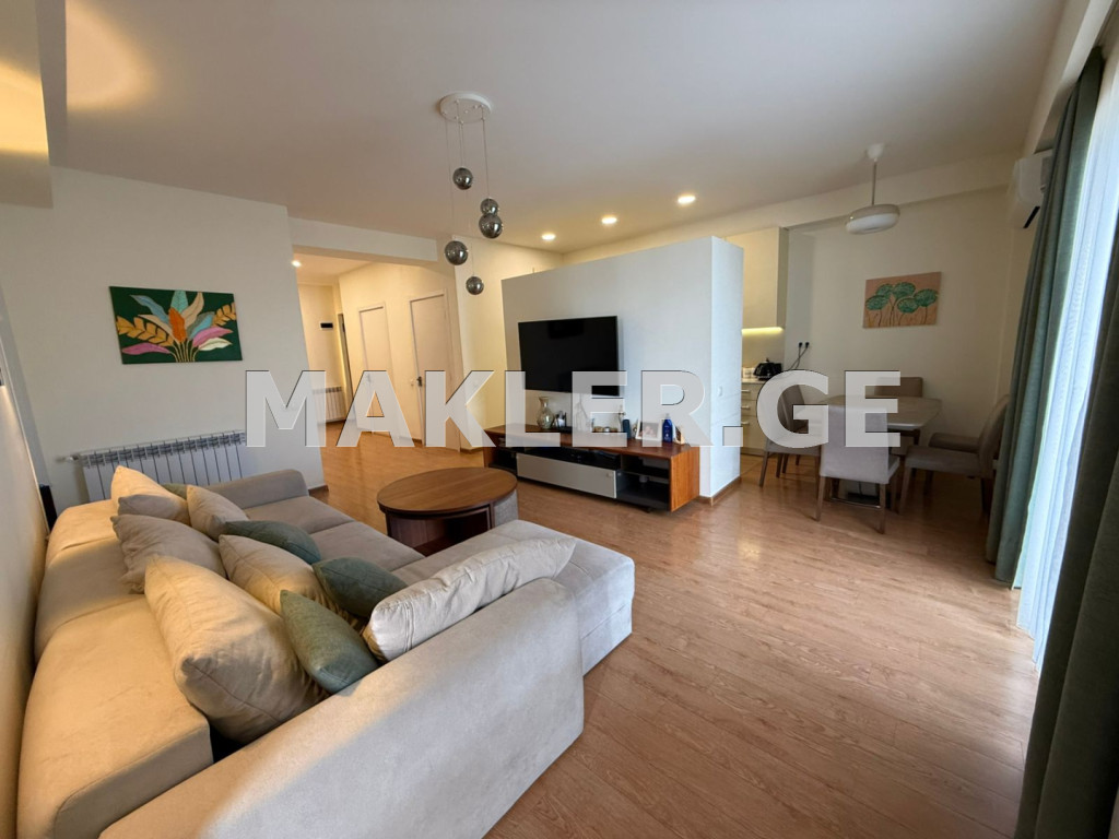 * Alan: 120 m² • Daire çok aydınlık, sıcak ve rahattır. * İdeal bir tasarıma sahip olup, tek bir metrekare bile boşa harcanmamıştır. * Tüm alanlar fonksiyonel ve konforlu bir şekilde kullanılmıştır. * Mutfak ve oturma odası, hem mutfağı izole eden hem de alan israfını önleyen açık bir duvarla ayrılmıştır. * Dairede çamaşır odası ve raflı geniş bir depo bulunmaktadır. * Her iki balkon da Tiflis'in ideal manzarasına sahiptir. * Üç yatak odasının ve oturma odasının tamamında balkona açılan kapılar vardır. * Daire, Lisi Gölü'ne 5 dakikalık yürüme mesafesindedir. * Ankastre mobilyalar ve ankastre cihazlar dairede kalacaktır.